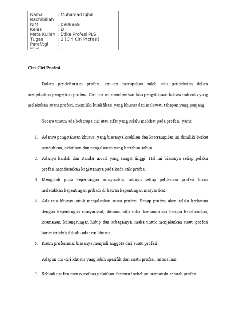 Cekap, cepat dan tepat tuntutan kerja. Suatu kegiatan atau pekerjaan yang semula dihubungkan dengan sumpah dan janji bersifat religius. Bersih, jujur dan amanah amalan mulia ciri #2 : Komunikasi adalah segala sesuatu yang berhubungan dengan pengiriman, penerimaan dan seseorang yang memiliki etika kerja yang baik akan lebih mudah membangun relasi dengan orang lain. Di bawah ini dikemukakan beberapa ciri profesionalisme :
