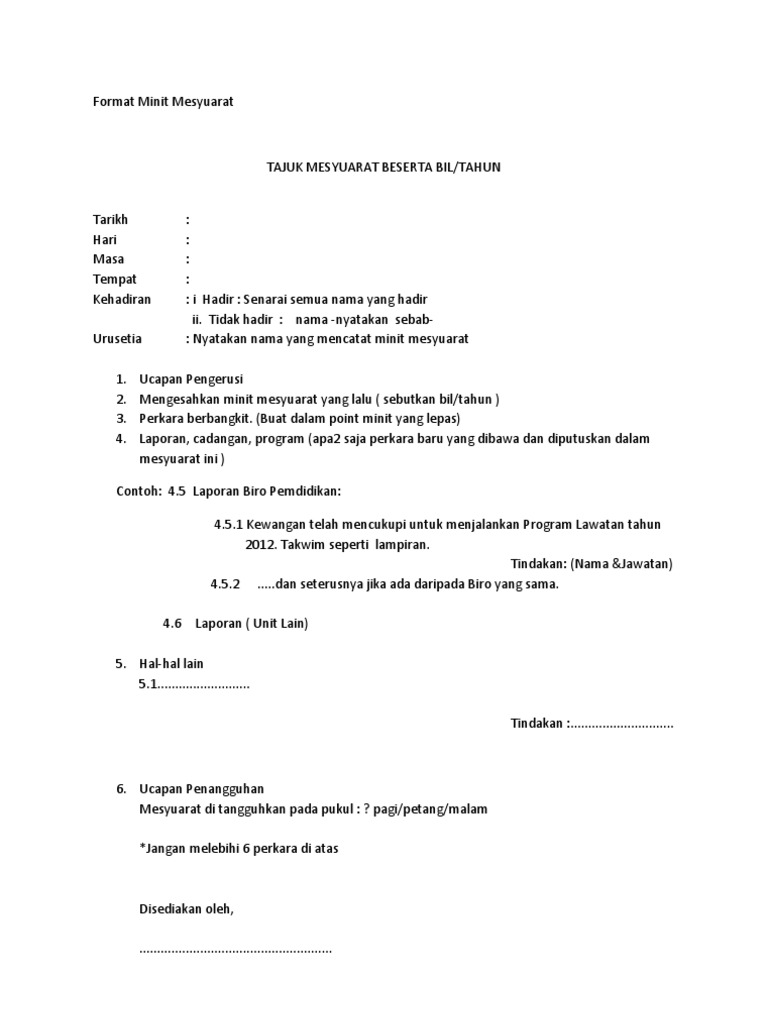 6 perkara yang perlu dalam penyediaan minit mesyuarat? Minit mesyuarat penting kerana minit merupakan sumber rujukan masa hadapan. Jika perkara berbangkit itu masih memerlukan tindakan, catatkan juga agensi atau. Format tidak terlalu berbeza tidak kira anda mesyuarat anda adalah mesyuarat panatia subjek, mesyuarat pibg, meeting kokurikulum. Hasil kerja murid yang terbaik perlu disimpan dan dipamerkan di dalam bilik.