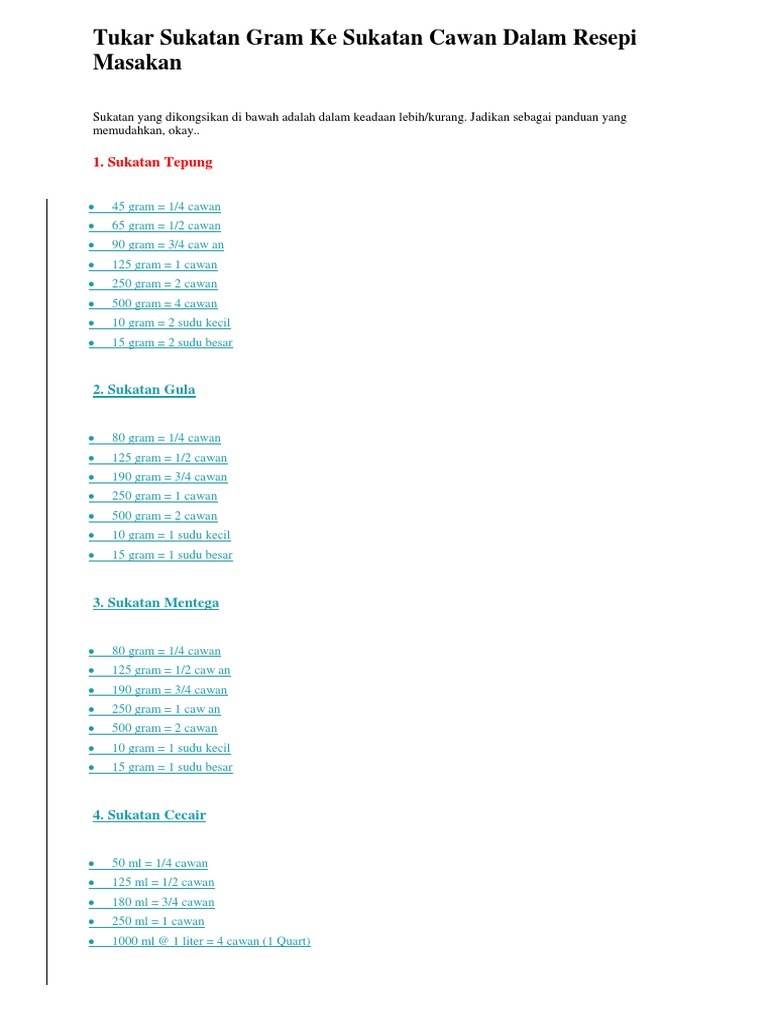 0 ratings0% found this document useful (0 votes). Bahan bahan 5 biji telur gred a 1 cawan gula halus (200gm) 1 sudu besar ovalette 1/4 cawan santan pekat (kotak) (65ml) 1 sudu. Savesave tukar sukatan gram ke sukatan cawan for later. Sukatan cawan m a k kepada gram untuk kemudahan anda measure cup to gram by m a k vlog 0221. Untuk mengubah satuan gram ke mililiter digunakan besaran penghubung yaitu massa jenis bahan.